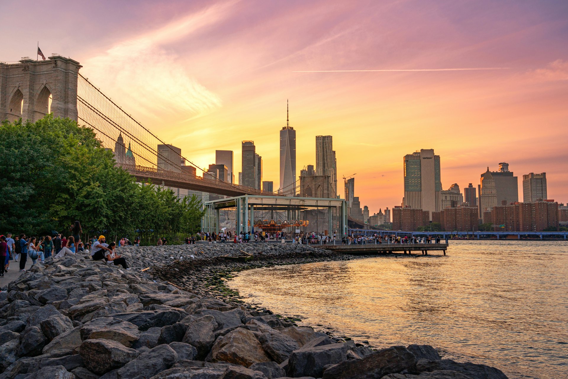You’ll find art galleries, tech offices, waterfront parks, cafés, and boutique fitness studios. It’s also one of the most photographed areas in the city, especially around Washington Street with the bridge view.